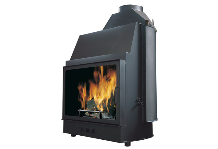 Chimena de agua con estructura de acero de gran espesor. Con mecanismo automático de humos by-pass, cristal cerámico resitente a 800º C y registro de regulación de aire de combustión.