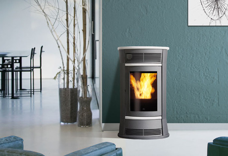 Termoestufa de pellet con laterales de acero e inserciones de cerámica.